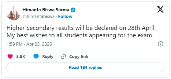 Assam Chief Minister Himanta Biswa Sarma announced the date for the AHSEC Class 12 results in an official tweet. The tweet reads, "The results of the Higher Secondary examination will be declared on April 28. My best wishes to all the students who appeared for the examination."