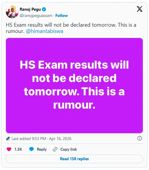 On April 16 at 9:53 PM, Education Minister Ranoj Pegu took to X (formerly Twitter) to dismiss the rumors circulating among students and across social media platforms. His post clearly stated: