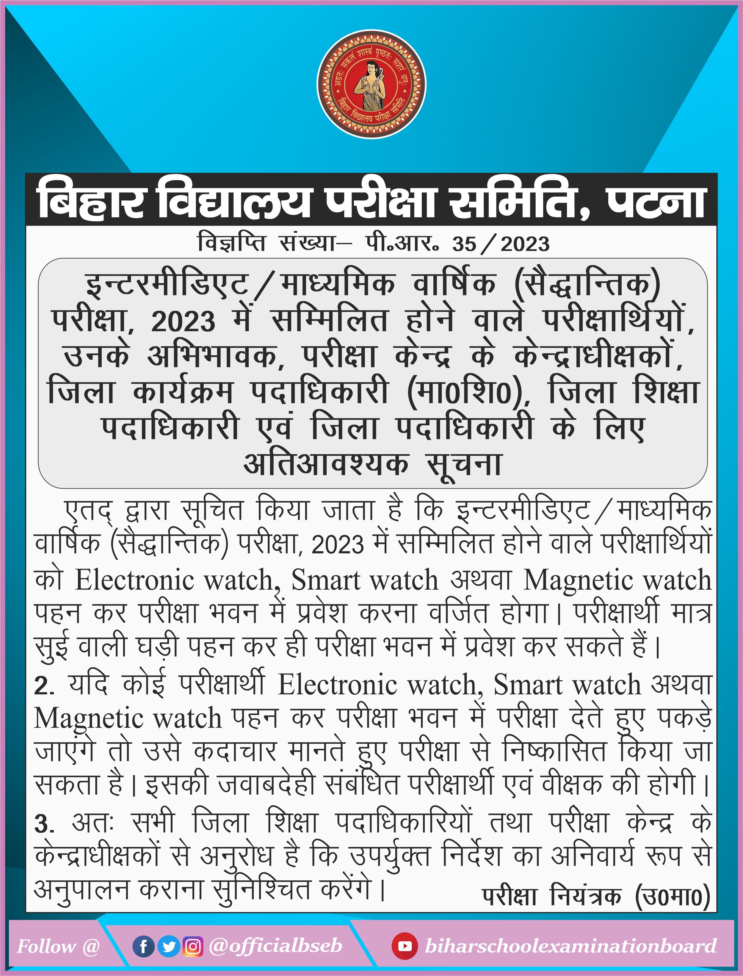 परीक्षार्थी सिर्फ सुई वाली घड़ी पहनकर परीक्षा भवन में प्रवेश कर सकते हैं। अगर कोई परीक्षार्थी इलेक्ट्रॉनिक, स्मार्ट या मैगनेटिक वॉच पहनकर परीक्षा देते हुए पकड़ा गया तो उसे निष्कासित किया जा सकता है। इसकी जवाबदेही संबंधित परीक्षार्थी और वीक्षक की होगी। बिहार बोर्ड ने सभी जिला शिक्षा पदाधिकारियों व परीक्षा केंद्र के केंद्राधीक्षकों से इन गाइडलाइंस का अनिवार्य रूप से पालन करने के लिए कहा है।