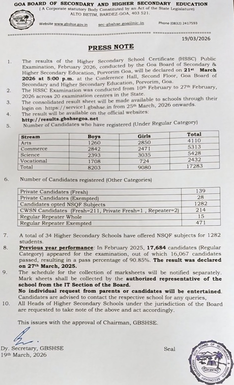 Schools will begin receiving the consolidated result sheets for the Goa HSSC examination starting March 25, 2026, via their service login portal at service1.gbshse.in. The results will be formally announced in the conference hall at the Board's office located in Porvorim.