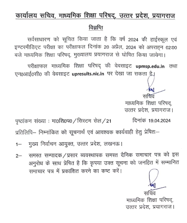 यूपी बोर्ड परीक्षार्थी अपना रिजल्ट देखने के लिए results.upmsp.edu.in, upmsp.edu.in और upresults.nic.in पर चैक कर सकते हैं. पिछले वर्ष बोर्ड का रिजल्ट 25 अप्रैल को घोषित किया गया था. इस बार पांच दिन पहले रिजल्ट घोषित कर रिकॉर्ड बनाया जा रहा है. वहीं, इस बार केवल 12 कार्य दिवसों में मूल्यांकन का कार्य पूरा कर लिया गया था. पिछले वर्ष यह 15 दिन में पूरा हुआ था.