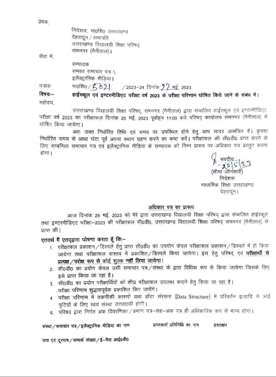 परिषद की सचिव नीता तिवारी ने बताया कि 25 मई को प्रात: 11 बजे रिजल्ट घोषित किया जाएगा। हालांकि रिजल्ट शिक्षा मंत्री धन सिंह रावत घोषित करेंगे या फिर माध्यमिक शिक्षा निदेशक सीमा जौनसारी घोषित करेंगी। इस बारे में परिषद ने अभी स्पष्ट नहीं किया है।