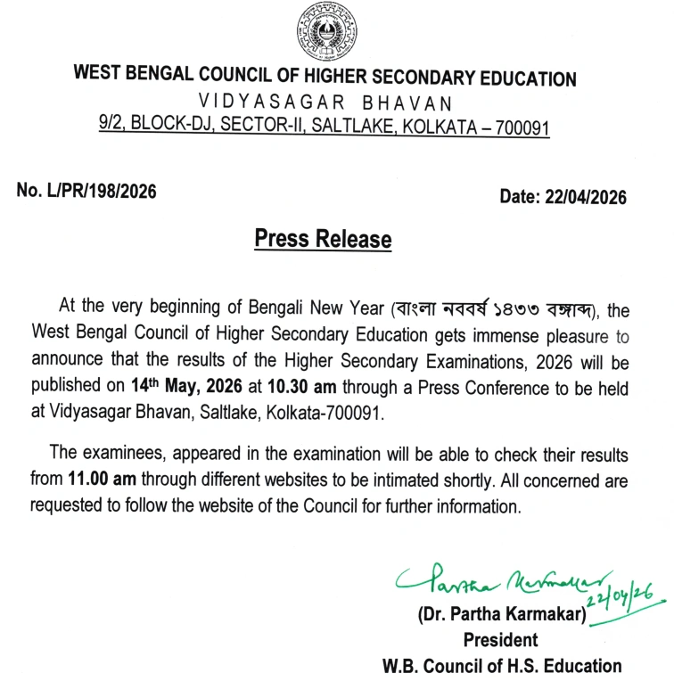 The wait for West Bengal Class 12 students is finally over. The West Bengal Council of Higher Secondary Education (WBCHSE) has officially announced that the Higher Secondary Result 2026 will be declared on May 14, 2026.